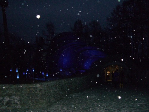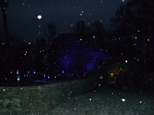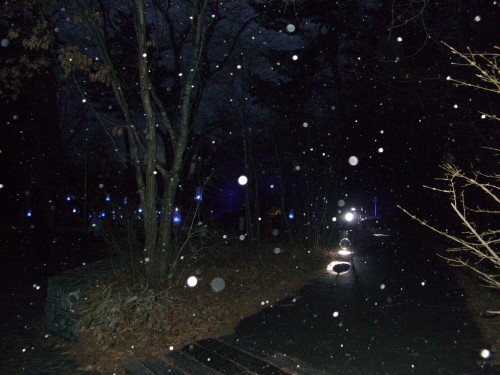 タイミングよく降りだした雪が青いライトに照らされ、幻想的な雰囲気。